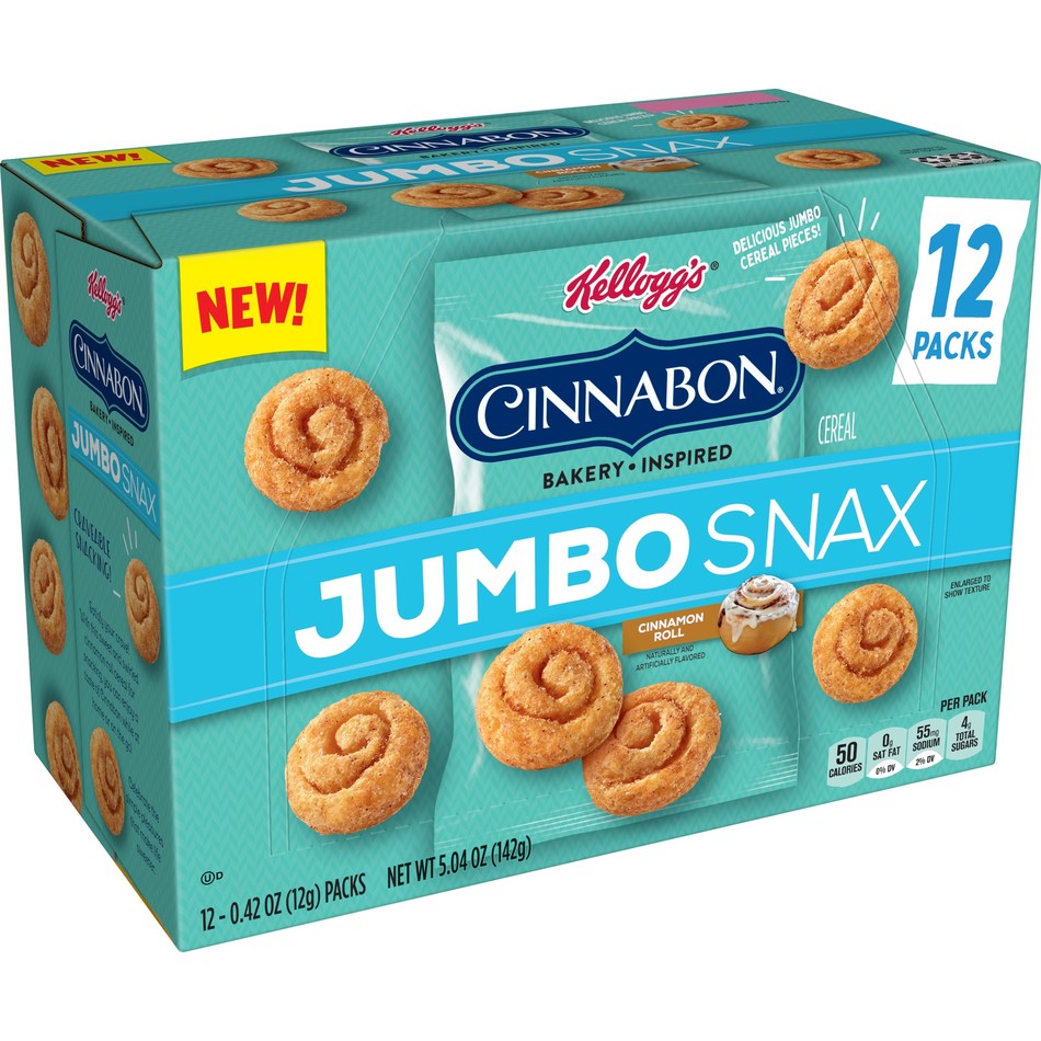 Whether they are home or on the go. Kellogg’s Adds Cinnabon and Smorz Jumbo Snax To Snack Lineup. Head to a cereal aisle near you and pick up these Jumbo Snax, no spoon or bowl needed!