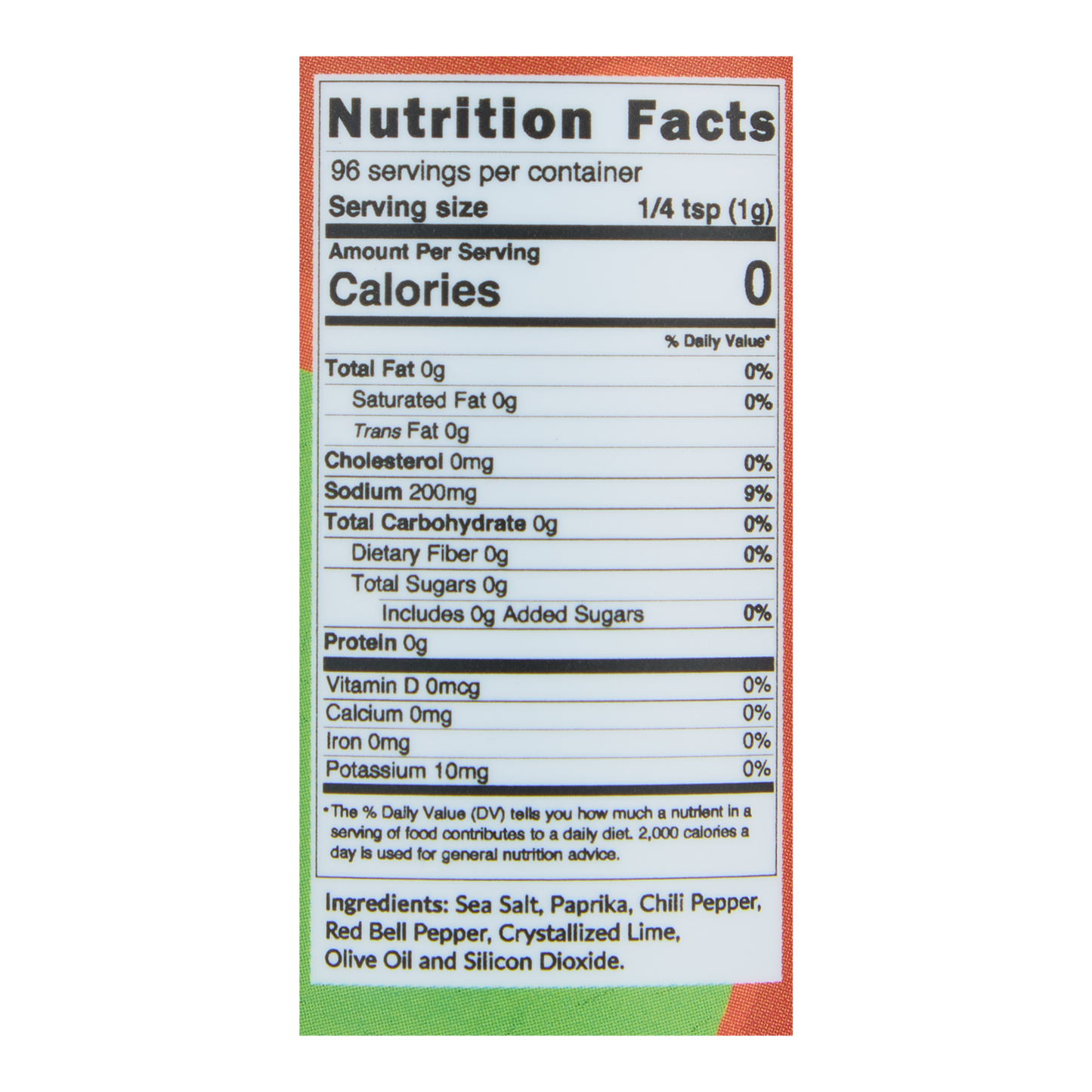 Sea Salt, Paprika, Chili Pepper, Red Bell Pepper, Crystallized Lime, Olive Oil, and Silicon Dioxide