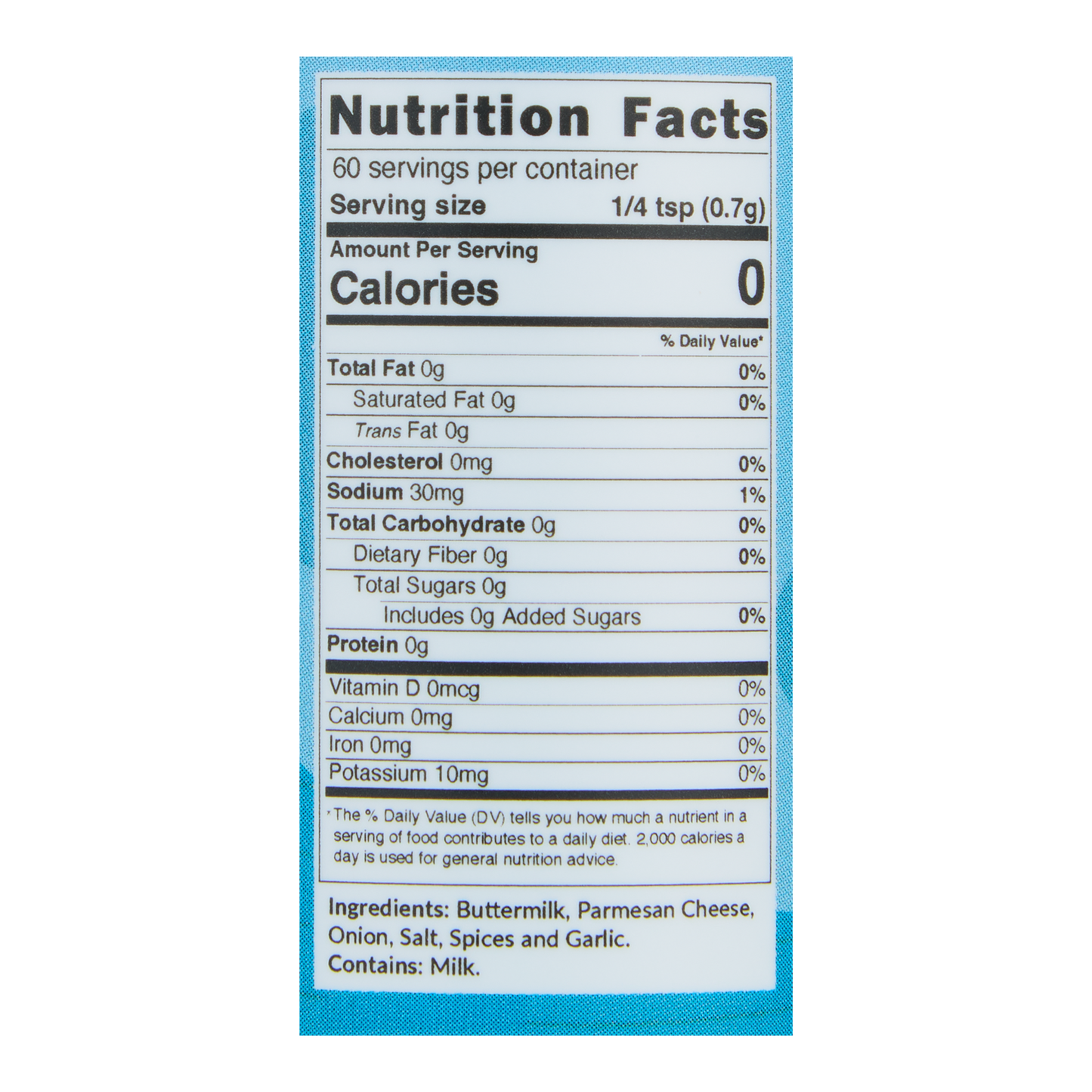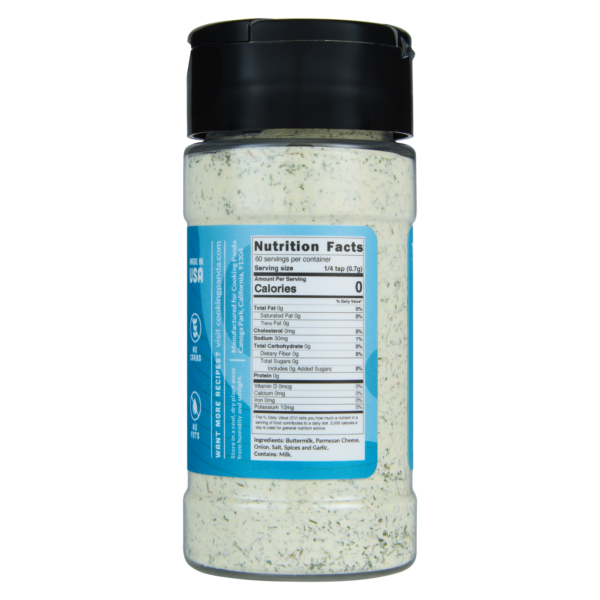 Buttermilk (sweet cream buttermilk solids), Parmesan Cheese (milk, salt, culture, enzymes, disodium phosphate), Onion, Salt, Spices and Garlic